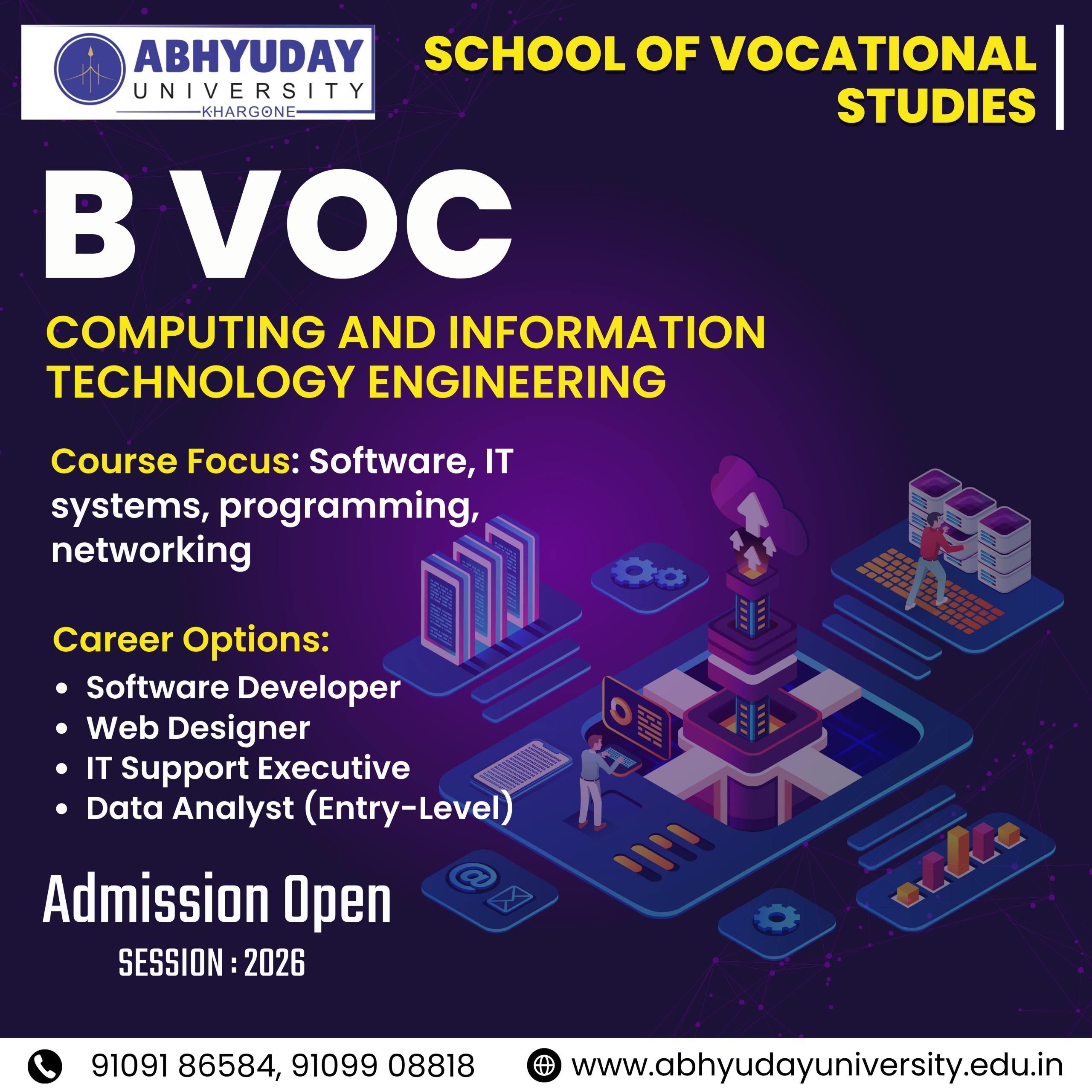 B.Voc in Computing & Information Technology Engineering is a skill-oriented program designed to meet the growing demand of the digital industry. It focuses on practical knowledge of software development, IT infrastructure, and emerging technologies. The course blends theoretical concepts with hands-on training in programming, web development, networking, and cybersecurity. Students gain real-world exposure through projects, internships, and industry-based learning, making them job-ready for IT companies, startups, and digital enterprises.